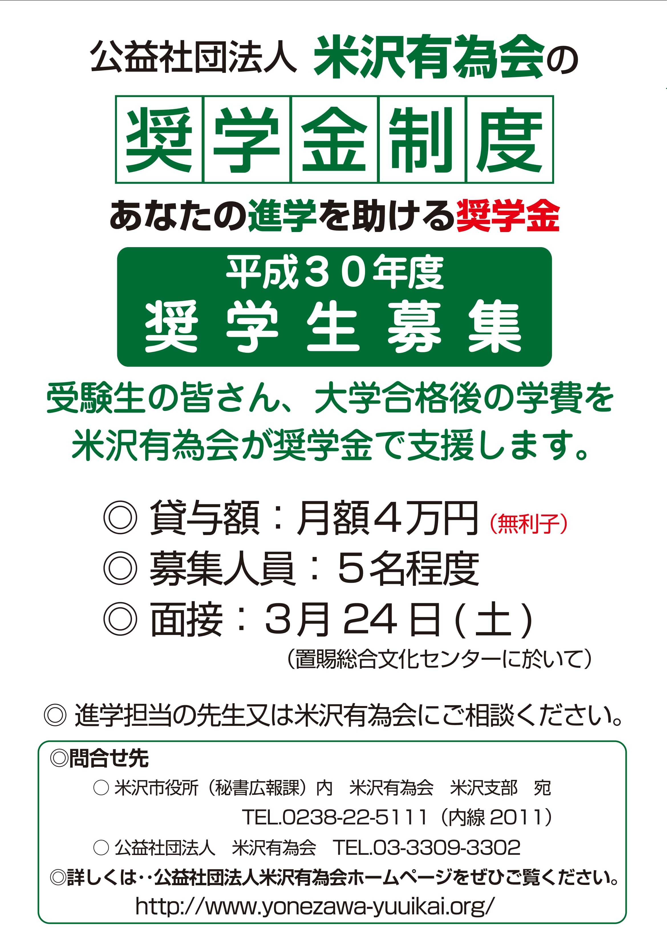 米沢市ホームページに制度の概要が掲載されていますので参考にしてください。 なお米沢有為会奨学金が対象となる募集についての詳細は平成30年2月中にアップされる予定です。